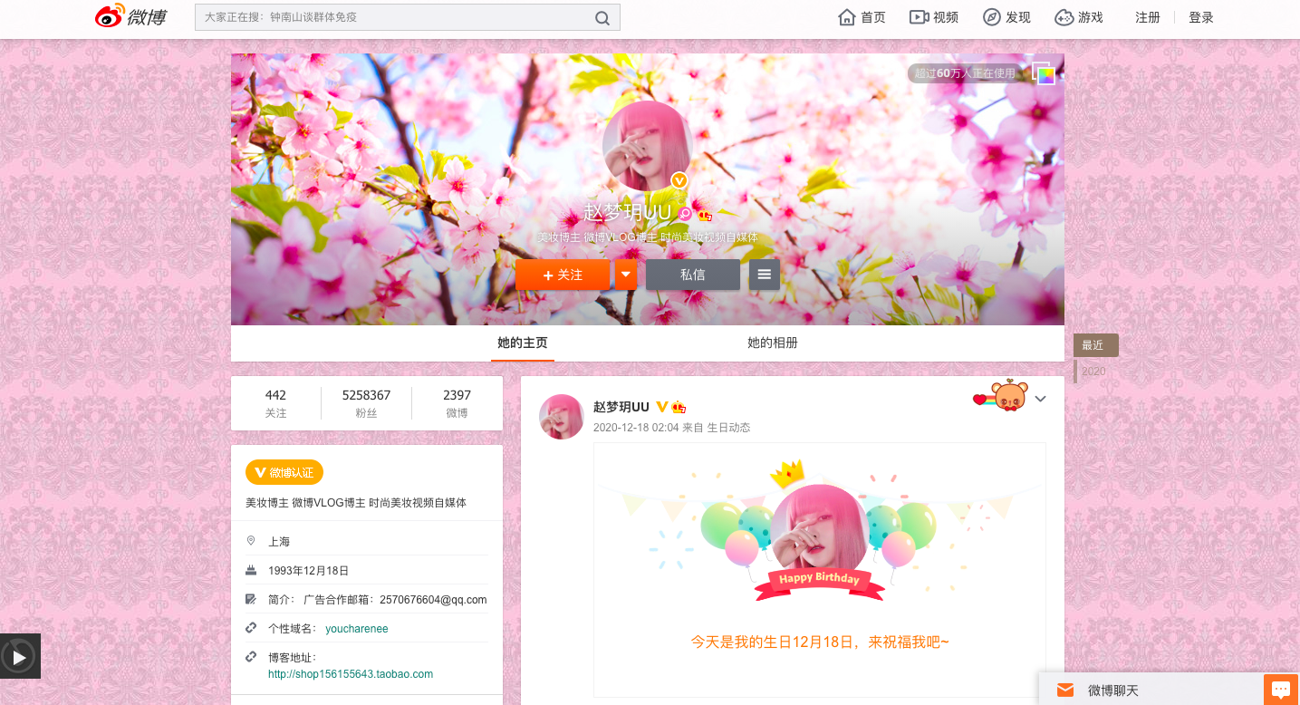 事例として中国で有名なWeiboというサービスでは、赵梦玥UUというモデル出身の方が人気です。
