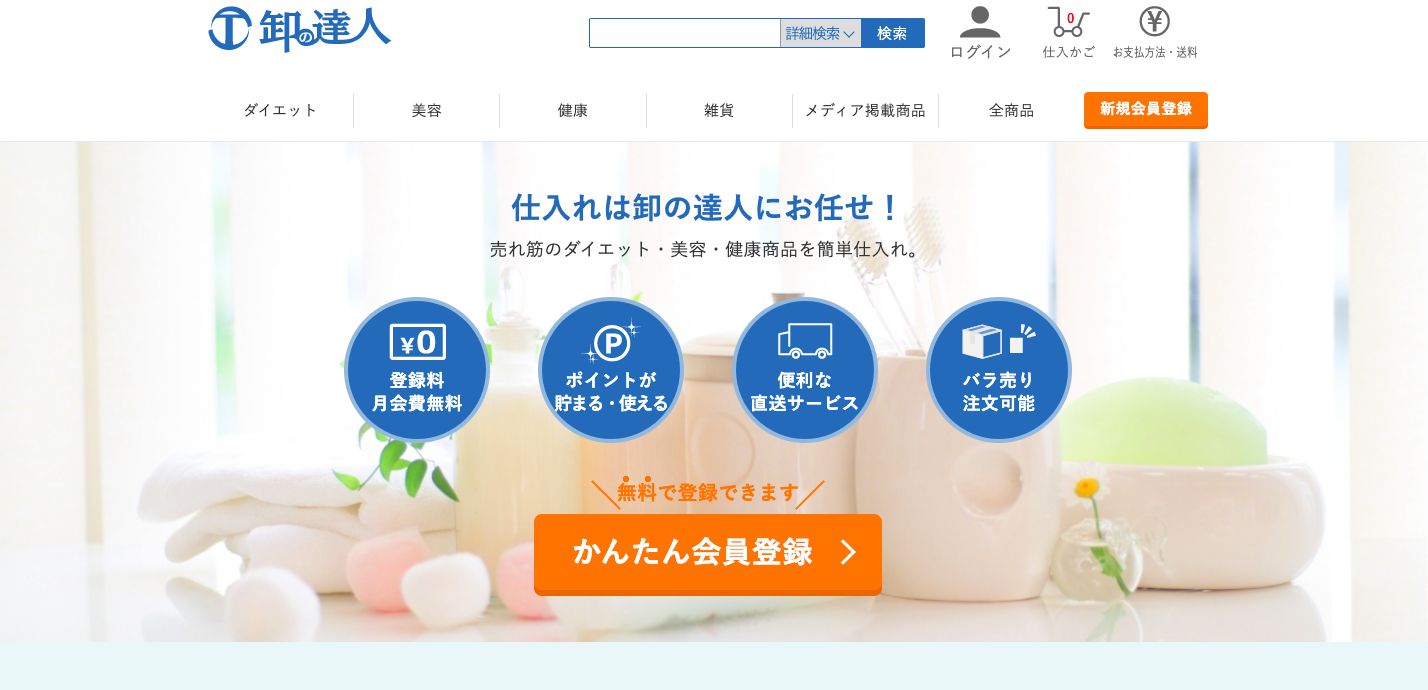 美容や健康商品を主に扱っているサイトです。取引をするとポイントを100円につき1ポイント貯めることができ、実際に商品購入の際に使うことも可能です。また、直送サービスもあり在庫負担なく販売可能でリスクゼロで始められるのも注目ポイントです。審査のハードルも低いため、ドロップシッピングをはじめる人は、挑戦しやすいと言えるでしょう。実際に1点から仕入れ可能ですので、大口の顧客がいなくても大丈夫です。